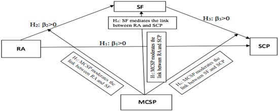 The present work constructs the conceptual model below to examine the RA–SCP relationship and also test the hypotheses. Figure 1 displays the conceptual model. As revealed in Figure 2, we attempted to explore the direct and indirect effects (through SF) of RA on SCP. In addition, we aimed to probe whether MCSP plays a moderating role between the interested variables.