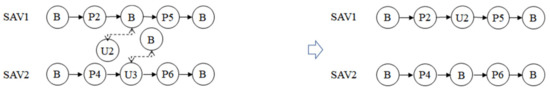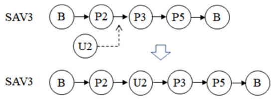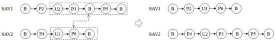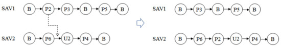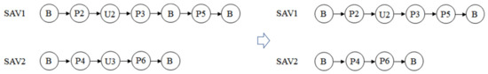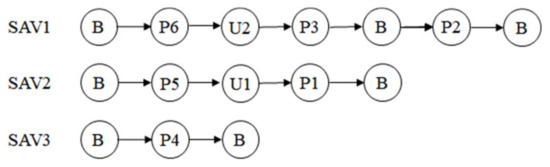 As shown in Figure 2, we use label sequences to represent the routes of SAVs. B, U, and P denote the base, parking lots, and travel demands, respectively. If all constraints are satisfied, then combining all label sequences is a feasible solution. Furthermore, according to the time constraints, we can obtain the arrival and departure times of SAVs at each node and thus we can calculate the system cost.