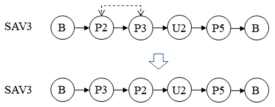 - 2-opt operator [40]. This kind of operator randomly reverses several adjacent travel demands on a randomly selected sequence. Figure 5 shows an example. In this study, there are four operators of this type, each operating on 2, 3, 4, and 5 adjacent travel demands.
