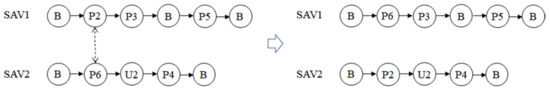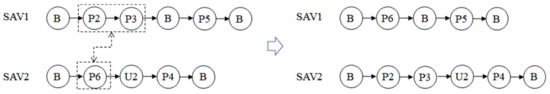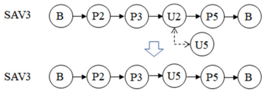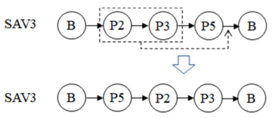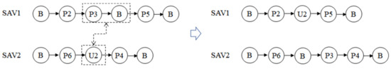 - Parking label replacement operator. This kind of operator randomly replaces several parking labels on several randomly selected sequences. The replaced parking labels include parking lots and the base that is not in the first and last position. Figure 4 shows an example. In this study, there are five operators of this type, each operating on 1, 2, 3, 4, and 5 parking labels.