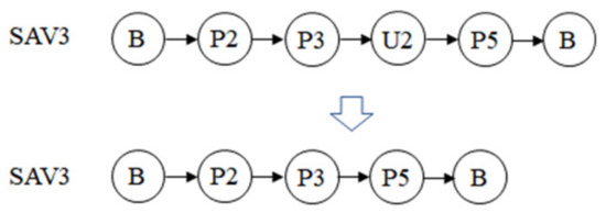 - Parking label removal operator. This kind of operator randomly removes several parking labels on several randomly selected sequences. The removed parking labels include parking lots and the base that is not in the first and last position. Figure 3 shows an example. In this study, there are five operators of this type, each operating on 1, 2, 3, 4, and 5 parking labels.