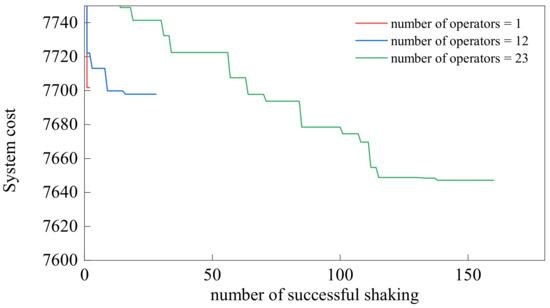 Figure 15 shows the variation of system cost with the number of successful shakings under the different number of operators in the shaking procedure. It is evident that the algorithm reduces the system cost effectively compared to the initial solution. In addition, it can be seen that with the increase in the number of operators in the shaking procedure, the number of successful shakings increases, and the algorithm can achieve better system cost. This is because the more shaking operators bring more possibility to get out of the valley and restart the local search. Accordingly, the runtime also increases, with results of 188 s, 779 s, 2717 s, and 4182 s.