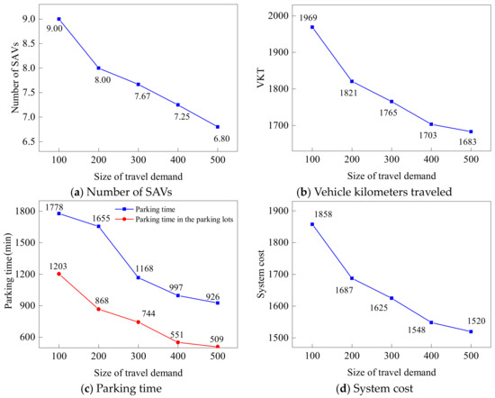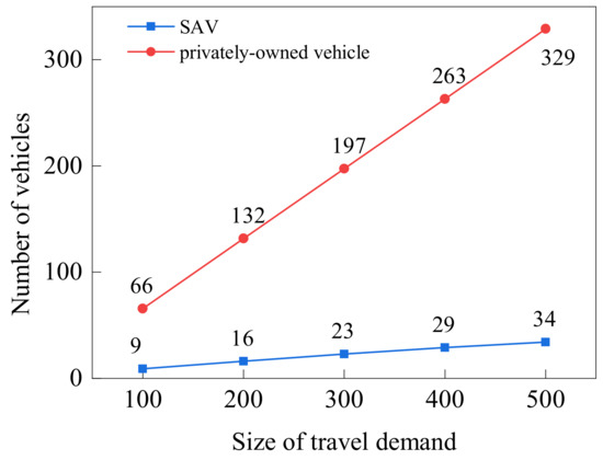 The travel frequency of private vehicles is 1.52 times a day [27]. If all travel demand is satisfied with the privately owned vehicles, the number of private vehicles should be size of travel demand/1.52. Figure 17 indicates that the required number of SAVs is much less than the number of private vehicles. This also demonstrates the significant role of SAV in saving resources and promoting sustainable urban development.
