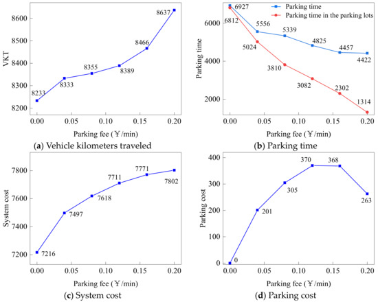 With the travel demand size of 500, we check the effects of the parking fee. Figure 18 shows the effects of varying parking fee in the parking lots from 0 ¥/min to 0.2 ¥/min with a step of 0.04 ¥/min.