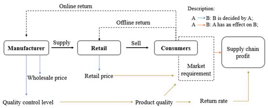 Product quality problems can lead to consumer returns, and many studies on supply chains have explored the impact of returns on the supply chain [12,13]. Wang et al. [14] emphasized that online retailers are facing increasingly severe product return problems, and the high average return rate leads to the loss of performance of online retailers. Lin et al. [15] constructed a supply chain model consisting of a manufacturer and a retailer with corporate social responsibility to address the issue of manufacturer’s quality improvement strategies in response to consumer returns due to quality issues. Pei [16] considered the impact of product quality on the return rate when studying product pricing and product quality decisions. Ni [17] discussed three return channels for product heterogeneity returns and found that when the liquidator was introduced into the return processing channel, the supply chain profit was higher than the other two return channels. Zhang et al. [18] studied the impact of returned incomplete products on the vertical dual-channel management of a closed-loop supply chain. In addition, some scholars have conducted research on consumers’ cross-channel returns. Zhang et al. [19] introduced the revenue sharing coordination contract strategy under the online and offline cooperation mechanism when discussing the impact of cross-channel return service on supply chain enterprises. Yang et al. [20] proposed a benchmark strategy, an original channel return strategy and a cross-channel return strategy and concluded that the cross-channel return strategy is more conducive to retailers. Pan et al. [21] pointed out that there is a significant impact on the pricing strategy and profit distribution of a closed-loop supply chain between the cross-channel return rate and consumer channel preference. Zhang et al. [22] proposed that in the case of providing and not providing cross-channel return services, when the spillover effect is greater than the threshold, retailers will cooperate with manufacturers to adopt cross-channel return policies. In summary, consumer return behavior and its impact cannot be ignored in supply chain optimization.