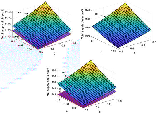 It can be seen from Figure 2 that the total profit of the supply chain in the five models is positively correlated with and .