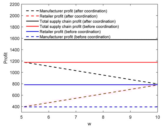 According to the parameter values in this section, the wholesale price ranges from 5.0557 to 10.1752. From Figure 4, it can be seen that contract coordination has a significant effect on the improvement of supply chain profits; the profits of the manufacturer and retailer after contract coordination are higher than those before contract coordination. As wholesale prices rise, manufacturers’ profits are gradually shrinking, while retailers’ profits are increasing. According to the graph trend in Figure 4, when the wholesale price value is not within [5.0557, 10.1752], the contract coordination fails, which verifies the rationality of Proposition 14.