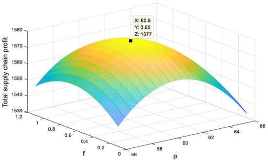 Taking the centralized decision model as an example, the optimality of the solution is verified. The validity of the research method in this paper is verified. As can be seen from Figure 5, there is a unique optimal value for the total profit of the supply chain, and the optimal solution corresponding to the optimal value is consistent with the statements in Table 5 and Proposition 5. This proves the validity of the research method and verifies the proposition of decision result in the paper.