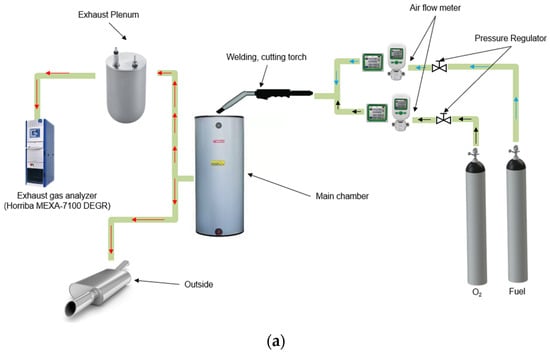 The schematic designs for the exhaust gas measurement system and the experimental setup are shown in Figure 1a,b, respectively. The experimental system consists of 7 components. The feed tanks supply the air and fuel to the torch, and the airflow meters are used to manage the flow rate of the fuel mixture. The torch is employed to burn fuel inside the main chamber, and an exhaust gas chamber is added to maintain the homogeneity of the exhaust gas and enhance the measurement accuracy. The signal from the exhaust gas temperature sensor is analyzed using an exhaust gas analyzer (Horiba MEXA-7100 DEGR). The experiments were performed in a well-ventilated laboratory environment with the torch system placed on a laboratory bench. The gas pressure, flow rate, and torch-to-workpiece distance were adjusted as required. The torch was connected to a regulator, which controlled the pressure of the fuel mixture gas, and it was mounted on a stand to ensure stability during the experiments. The fuel was stored in a feed tank and delivered to the torch system through a flexible hose. The air and fuel pressure were measured using a pressure gauge installed on the regulator, and the gas flow rate was measured using a flow meter installed on the flexible hose. The gas pressure and flow rate were adjusted using the regulator to achieve the desired operating conditions. The tests were conducted under steady-state conditions at near-room temperature conditions of approximately 27 °C.