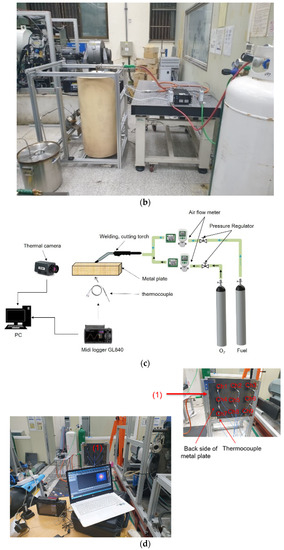 The experiment setup and schematic design for the preheating procedure are shown in Figure 1c,d, respectively. The metal plate’s total width, length, and thickness were 0.5 m, 0.5 m, and 0.03 m, respectively. The distance (d) between the torch outlet and the metal plate was 0.06 m. The gas torch combined fuel and air to facilitate combustion. After leaving the exits of the gas torch, the mixture of fuel and air was ignited, generating a combustion flame for preheating the metal plate. The operating conditions were optimized to achieve the best performance of the torch system using LPG as fuel. The optimal gas pressure and flow rate were determined based on the statistical analysis of the data. The torch-to-metal plate distance was also optimized for optimal performance. The temperature distribution on the reverse side of the metal plate was measured using a TVS-200EX infrared camera, as shown in Figure 1d. To compensate for the lower sensitivity of the infrared camera, an additional thermocouple sensor connected to a Midi logger 840 was employed for temperature measurements. To measure the temperature distribution of a metal plate during the preheating process, 9 thermocouples were positioned on the rear of the plate in three lines. The upper line’s temperature was measured using Ch1, 2, and 3, the middle line’s temperature was obtained using Ch4, 5, and 6, and the lower line’s temperature was measured using Ch7, 8, and 9. The calibration of the equipment is shown in Table 1.