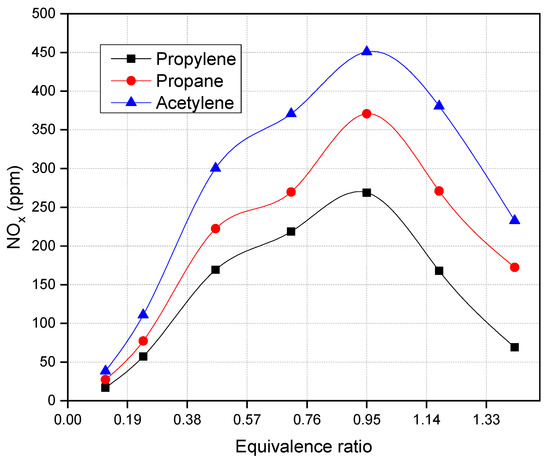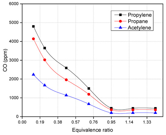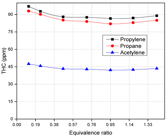 Figure 4 depicts the influence of the equivalence ratio on CO emission. The results demonstrate that lowering the equivalence ratio increases CO emissions. It is understandable that increases in CO emission with a decrease in the equivalence ratio were brought on by a drop in the oxygen concentration. Furthermore, because THC emissions rise with lambda (air/fuel) when the relative air–fuel ratio is larger than 1, the presence of unburned hydrocarbons in the reaction zone slows CO oxidation, as seen in Figure 4. Therefore, CO emissions increase during times of oxygen scarcity, implied by the single oxygen atom in the carbon monoxide structure. Furthermore, acetylene creates far less CO than propylene and propane fuel because of its unique combustion properties and the stoichiometry of its combustion reaction. The stoichiometric ratio for acetylene combustion is much lower than for propylene and propane. This means that a smaller amount of air is needed to combust a given amount of acetylene relative to the other fuels. Furthermore, the combustion reaction of acetylene is highly exothermic, meaning that it releases a large amount of heat when it reacts with oxygen. This high heat release helps to ensure that complete combustion occurs, reducing the formation of harmful byproducts like CO.