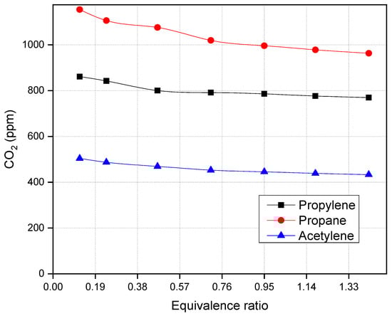 Figure 3 depicts the effect of the equivalence ratio on CO2 emissions. The findings demonstrate that the carbon dioxide (CO2) emission decreases as the equivalence ratio values increase. The impact of the equivalence ratio on CO2 emissions is relatively minimal compared to other emissions. CO2 is primarily determined by the carbon content in the fuel rather than the equivalence ratio. However, extremely high equivalence ratios can lead to incomplete combustion and increased CO2 emissions. Aside from that, propane emits significantly more CO2 than other gases. The fuel is completely burned, leaving behind only carbon dioxide (CO2) and water. It is evident that propane fuel burns more completely than propylene and acetylene fuel because of its molecular structure and combustion characteristics. Propane gas has a relatively simple chemical structure, which makes it easier to burn completely in the presence of oxygen. Propane gas also has a narrower flammability range, enabling better control and optimization of conditions for achieving complete combustion.