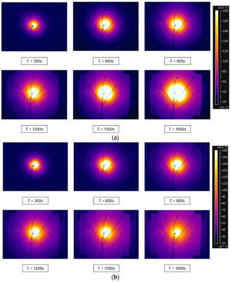 In Figure 7b, the temperature distribution of propane fuel is showcased. The central point temperature of the propane fuel gradually increases from the starting temperature and reaches 211.05 °C after 540 s. However, unlike propylene fuel, the temperature profile of propane fuel does not stabilize and continues to exhibit fluctuations beyond the experimental timeframe. This indicates the potential for a further rise in temperature or variability. Impressively, the central point of the propane fuel records a maximum temperature of 347.65 °C at 1800 s, indicating a higher peak temperature compared to propylene fuel.