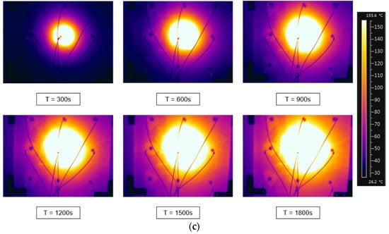 Figure 7c illustrates the temperature distribution of acetylene fuel. Similar to propylene fuel, the central point temperature of acetylene fuel experiences a rapid initial increase. Within 480 s, the temperature rises quickly from the starting temperature to 301.45 °C. As the experiment progresses, the temperature of the acetylene fuel gradually stabilizes and approaches a steady-state value. At 1800 s, the central point of the acetylene fuel reaches a maximum temperature of 335.45 °C, indicating a relatively high peak temperature.