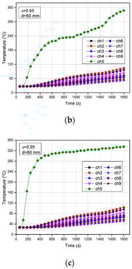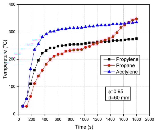 The temperature distribution as a function of time: (a) propylene fuel, (b) propane fuel, and (c) acetylene fuel.