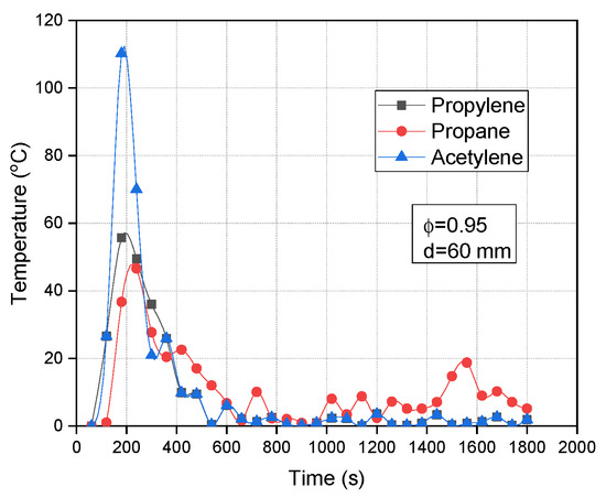 Figure 7a–c present the temperature distributions of propylene, propane, and acetylene fuels, respectively, as a function of time. These distributions provide valuable insights into the thermal behavior and characteristics of each fuel throughout the experimental duration.