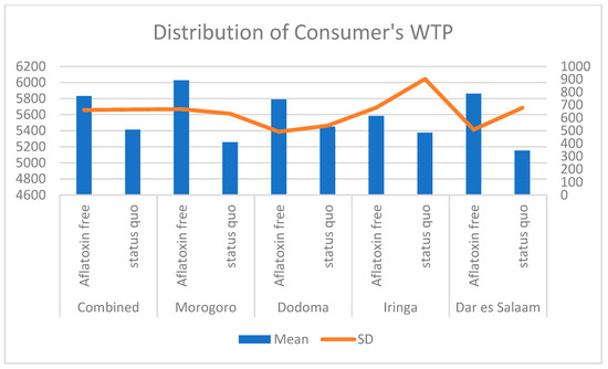 Apart from Iringa, the willingness to pay results from consumers in the other surveyed regions align well with the existing literature on aflatoxin cases and awareness. Consumers with higher levels of awareness demonstrated a higher willingness to pay, with Morogoro having the highest premium, followed by Dar es Salaam and Dodoma. However, surprisingly, consumers from regions with the highest reported cases of aflatoxin contamination exhibited the lowest willingness to pay. In the case of Dodoma, this can be attributed to low awareness levels, as seen in the study conducted by [41] where, despite the highest number of recorded cases in Dodoma, awareness of aflatoxin and its contamination of food products remained low due to the belief among locals that all the cases were caused by a regular food poisoning. Overall, the willingness to pay results are in alignment with the literature, and the characteristics of the surveyed regions in terms of aflatoxin cases and awareness, as explained in the research design section and supported by studies conducted by [2,42,44,46,47]. Due to the low level of awareness, consumers from Iringa and Dodoma were willing to pay, but not to the same extent as regions such as Morogoro, where the literature indicates a higher level of awareness compared to other regions.