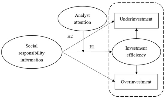 Due to the existence of information asymmetry, external investors cannot realistically estimate the value of investment projects, resulting in underinvestment, or management selectively discloses information that is beneficial to them and increases market investors’ expectations for investment projects, leading to the problem of excessive investment. When CSR is disclosed by enterprises with analysts’ concerns, CSR information disclosure provides additional information for analysts’ forecasts. The improvement of CSR disclosure level improves the accuracy of analysts’ forecasts, and analysts can effectively transmit real investment information to market investors, provide useful information for investors, reduce the impact of information asymmetry on external investors, and thus improve investment efficiency [20]. Therefore, we assume that analysts’ attention plays a regulatory role in the relationship between CSR information disclosure and investment efficiency. Moreover, analysts’ attention partly overlaps with the market effect and supervision role of CSR information disclosure [44]. The impact of CSR information disclosure on investment efficiency may be affected by differences in analysts’ attention. It is generally believed that the higher the analysts’ attention, the faster the information is excavated and disseminated [8], and the more transparent the information environment of the company [45], the greater the supervisory role of the company. Accordingly, the extent of their demand and dependence on corporate CSR disclosure is also weakened, and the supervision effect is also weakened. Conversely, if the analysts’ attention is lower, and the information environment is less transparent, the information that the company actively discloses will become the main source of information needed by investors [46]. In that case, the disclosure of CSR information or the improvement of information quality will increase the information content of the capital market and attract more attention from investors, and the more obvious the signal transmission effect will be. This is more convenient for enterprise impression management [7], which makes it easier for enterprises to disclose CSR to establish a good public image, win the favor of investors, and improve the investment efficiency of enterprises. Based on the above discussion, we argue that CSR information disclosure will be more obvious to the company’s investment efficiency when the analysts’ attention is low. The following hypothesis is therefore proposed, which supplements H1 to build up the theoretical framework of this paper (see Figure 1):