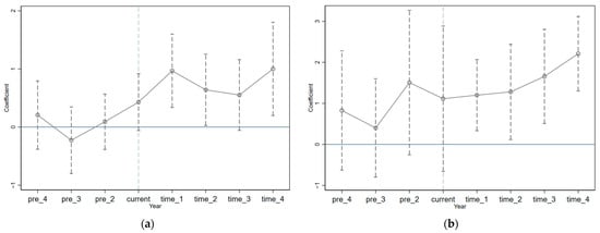 - Shortened sample period. To balance the sample period before and after the implementation of the EPR system, we shortened the original sample period from 2010–2020 to 2012–2020. We re-ran the regression analysis using this shortened sample period to examine whether the model changed due to the reduction in sample years. The results in columns (5) and (6) indicate that the robustness of our findings remains unchanged.