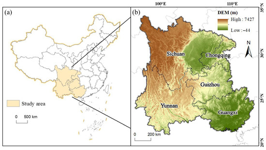 (a) Location of Southwest China and its five provinces, including Chongqing, Guangxi, Guizhou, Sichuan, and Yunnan. (b) Digital elevation model in Southwest China, ranging from a minimum elevation of −44 m to a maximum of 7427 m, displays a declining trend from west to east.