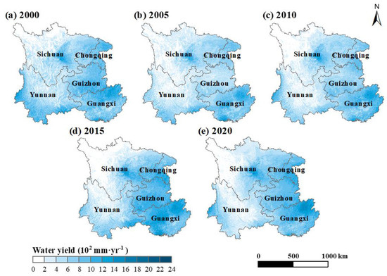 The evapotranspiration data were derived from A Big Earth Data Platform for Three Poles (https://data.tpdc.ac.cn, accessed on 29 February 2023). The data have a spatial-temporal resolution of daily and 500 m from 26 February 2000 to 31 December 2020. They have been widely applied in ecology studies, especially in Southwest China [49]. In the study, the resolution was resampled to 1 km using ArcGIS 10.4.1 and the lacking parts of 2000 were replaced by contemporaneous data from 2001. The actual evapotranspiration was the sum of the five types of evapotranspiration listed earlier and was used to calculate the water yield.