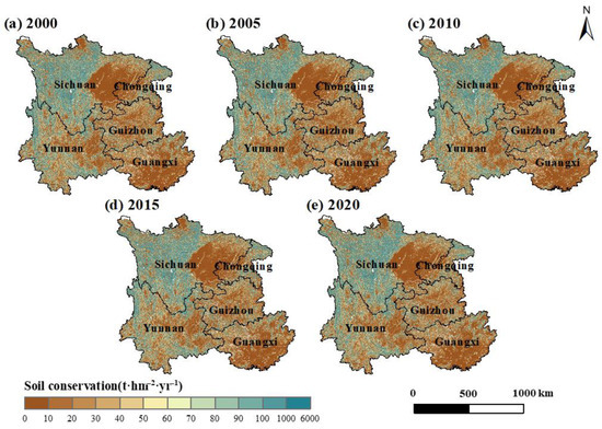 As illustrated in Figure 2, water yield exhibited a decreasing trend along the direction of southeast to the northwest from 2000 to 2020. Meanwhile, this study found that the marginal region of Yunnan province was apparently larger than the central zone for water yield, and West Sichuan has the least water yield. Strong spatial-temporal heterogeneity can be found for carbon sequestration in this region (Figure 3). Overall, Guizhou, Guangxi, and Sichuan provinces showed a broad trend of rising carbon sequestration, whereas Chongqing and Yunnan provinces fluctuated throughout the study period. It was interesting to note that the spatial patterns of soil conservation contrasted with the water yield in Southwest China (Figure 4). Most areas had lower amounts of soil conservation, except the western part of Sichuan province.
