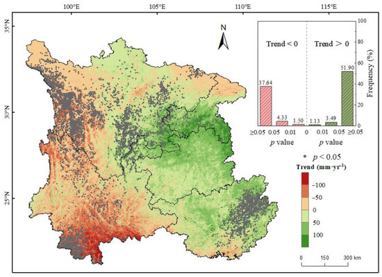 Spatial trend analysis and associated significant level of water yield in Southwest China from 2000 to 2020. Gray dots indicate areas that passed the significance test (p < 0.05). The bar graphs represent the frequency of the p value in the study area.