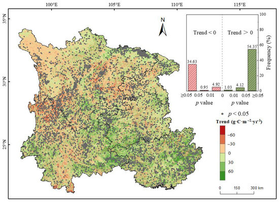 Spatial trend analysis and associated significant level of carbon sequestration in Southwest China from 2000 to 2020. Gray dots indicate areas that passed the significance test (p < 0.05). The bar graphs represent the frequency of the p value in the study area.
