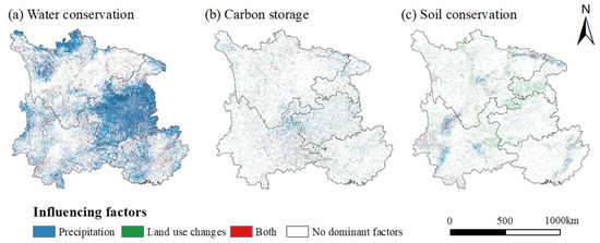 Spatial distribution of factors influencing ecosystem service functions over Southwest China during 2000–2020. Precipitation, land use changes, both and no dominant factors, regulating water conservation (a), carbon sequestration (b), and soil conservation (c) are represented by blue, green, red, and hollow portions, respectively.
