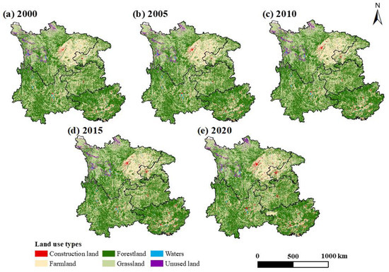 The land use data were derived from China’s National Land Use and Cover Change (CNLUCC) dataset during 2000–2020. The CNLUCC dataset was developed by the Data Center for Resources and Environment Sciences (https://www.resdc.cn, accessed on 28 October 2022), Chinese Academy of Sciences. It was based on visual interpretation of Landsat TM/ETM images with a spatial resolution of 1 km × 1 km. The coordinate system is WGS 84. Many researchers have proven that classification techniques above 92% were achieved through random sampling verification of survey sites in the field and assessments of the accuracy of the Kappa coefficient, which were applied in Southwest China [45]. The original CNLUCC dataset comprised 23 land use classes, based on a well-established hierarchical land cover classification system [46]. To facilitate the calculation of ecosystem service functions in this study, the 23 land use classes were further consolidated into six aggregated land use categories, namely construction land, farmland, forestland, grassland, unused land, and water. The land use data were used to calculate the crop management factor (C) and conservation support practice factor (P) in the RUSLE.