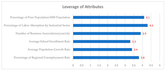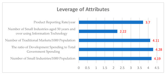 Based on the results of the leverage analysis measurement for economic sustainability, it is evident that five attributes were analyzed. These attributes were represented as index values derived from data obtained from various relevant agencies. The compilation of the index was based on the applicable sustainability index in Indonesia, as compiled by BAPENAS. Each of these attributes contributes to economic performance. Leverage analysis based on each attribute’s score determined each attribute’s position regarding economic performance. Among the attributes examined, three have shown to be particularly sensitive to the economic performance of small agro-industries in East Priangan: (1) Number of small industries per 1000 population; (2) Ratio of government development expenditure to total expenditure (government policy); and (3) Number of traditional markets/mini markets per 1000 population. These attributes demand attention and effective management to enhance the value of the economic dimension index in the future.