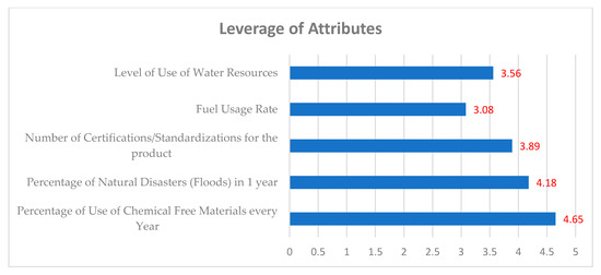 Based on the measurement of leverage analysis on six environmental performance attributes, the three most sensitive factors shape it: (1) Percentage of Chemical-Free Material Usage, (2) Percentage of Natural Disasters (Floods) in 1 year, and (3) Number of Product Certifications/Standardizations (Figure 7).