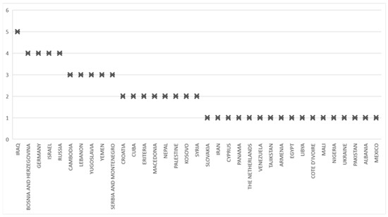 These 69 cases (68 reports) were classified into five groups according to the times the case (country) was examined. Only Iraq was included five times (Figure 1). In addition, cases were distributed as follows: 20 cases (19 reports), the Middle East; 19 cases, southeast Europe; 11 cases, Asia; 7 cases, equally for each Central Europe and Africa; 5 cases in Latin America. Thus, the maximum share of post-conflict cases was in the Middle East, which was followed by southeast Europe. Therefore, when it comes to safeguarding built heritage following conflicts, the Middle East could be a worrying scenario.