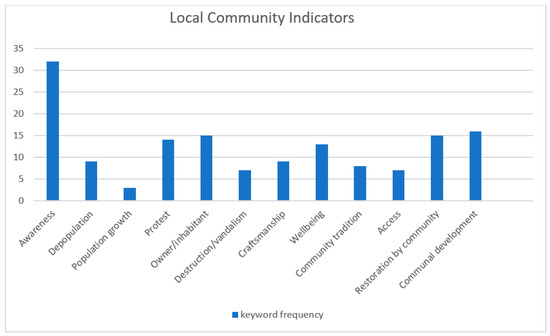 Thus, through a content analysis of these 69 cases, the most frequent indicators of LC and LR were identified. For LC, in addition to the word local, these keywords were identified: awareness, community, participation, growth, protest, owner/inhabitant, destruction, craftsmanship, well-being, tradition, access, restoration and development; for LR, these words were identified in addition to the word local: resources, funds, charity, experts/professionals, legislation, research, priority list/listing, media, institution, authority, investor and coordination. Then, the strength of each indicator was determined through keyword frequency.
