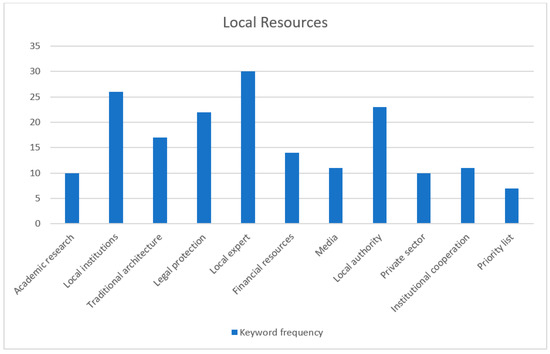 Thus, significant indicators for LRs according to keyword frequency are: the availability of local experts and local preservation institutions; local authorities and their role in providing a priority list, legal protection, coordination among related institutions, and financial resources; media and social media; local private sector investors; and local academic institutions through research.