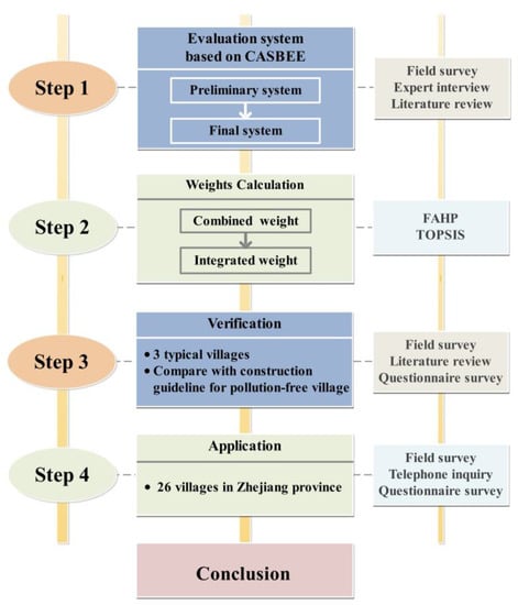 The major process of this research was divided into four steps as shown in Figure 1. Step one: According to the principle of CASBEE, the preliminary evaluation index system was established through a field survey, review of the literature, and expert interviews. This step was the foundation of the whole study; therefore, multiple rounds of expert consultation were carried out before determining the final evaluation index system. Step two: The combined weights and integrated weights at all levels were calculated by a combined FAHP-TOPSIS method, considering the influence of subjective and objective factors. Step three: In order to verify the accuracy of the evaluation system, three typical villages were chosen and evaluated thoroughly via a field survey, literature review, and questionnaire survey. Then, the evaluated results were compared with the existing construction guidelines for pollution-free villages. Step four: A total of 26 villages volunteered to participate in the evaluation at the construction level of their zero-pollution villages with field measurements and the questionnaire survey. In order to make the survey results more accurate, multiple telephone inquiries were conducted for some field investigations.