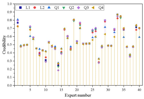 and the negative ideal value were all calculated according to Equations (12)–(17). Finally, the relative closeness (), namely, the credibility of the experts in L and Q, was obtained and illustrated in Figure 5. As shown in the figure, the credibility values of the experts differed depending on their age, work experience, education level, and familiarity with their profession. Most experts’ credibility of L and Q were very close, but there were also some experts whose credibility values had significant differences between these two parts. The reason for this was due to individuals’ different familiarity with different fields.