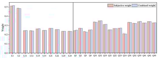The integrated weight refers to the weights of all indicators in the same layer of the evaluation index system, which can intuitively reflect the importance of each indicator. The integrated weights could be obtained by multiplying the combined weights of the upper and lower indicators, as shown in Figure 3. The calculation formula for this was as follows: