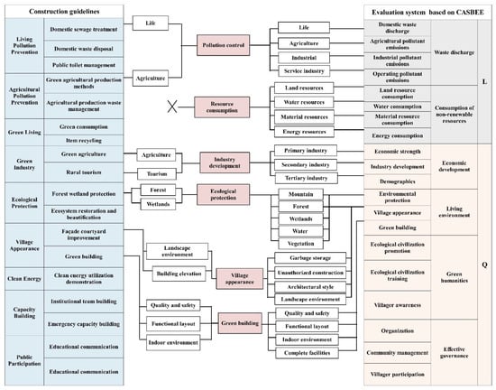 Based on the successful experiences of ecological villages at home and abroad, and the interviews with experts, a preliminary indicator evaluation system was constructed based on the principle of CASBEE with two target layers: Q and L. Multiple rounds of expert consultation were conducted after the initial construction of the evaluation system through field research, theoretical analysis, and the literature review until all experts reached a consensus. Finally, a synthesized evaluation model of a zero-pollution village was established with four levels, consisting of 2 target layers, 6 criterion layers, 21 sub-criterion layers, and 76 indicator layers. Figure 4 shows the framework of the evaluation index system for the zero-pollution village.