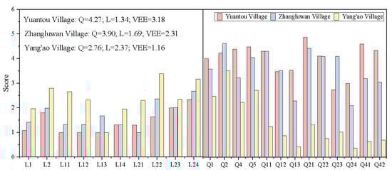 In order to evaluate the efficiency of the environmental impact, a single-value evaluation index and an assessment of the village environment efficiency (VEE) was introduced, whose value was the ratio of Q to L. A higher Q value and lower L value represent a higher internal environmental quality and lower environmental load and can lead to a higher VEE value, which means that a lower impact on the external environment can be achieved. On the contrary, a lower VEE value indicates greater damage to the environment, which is more detrimental to the sustainable development of rural communities.