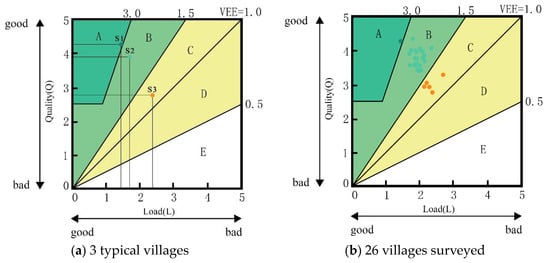 Furthermore, the Q values, L values, and VEE values of rural communities can be visually reflected in the two-dimensional zero-pollution village environmental evaluation map (Figure 2b). The zero-pollution village environmental assessment map not only evaluates the current pollution level and livability of rural communities but also compares the evaluation results between the present and the future with different policy measures []. Meanwhile, the graph area can be divided into five zones: Zone A is zero pollution, Zone B is low pollution, Zone C is general pollution, Zone D is heavier pollution, and Zone E is severe pollution. These five ranks, with a score of 1–5, are listed in Table 1.