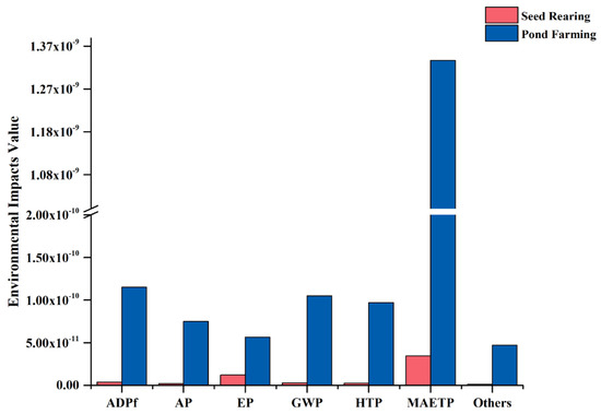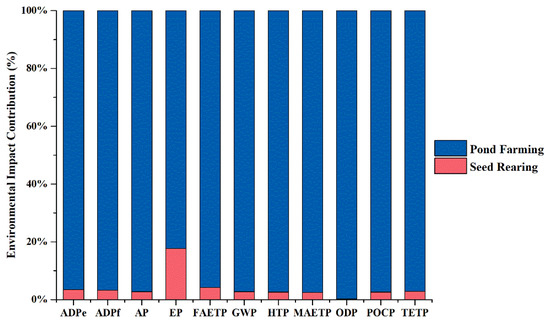 The contribution of the pond-farming stage to all 11 environmental impact categories was the greatest, and it is obvious that this stage is critical in the entire largemouth bass pond-farming process (Figure 2). The category with the highest percentage was ODP (99.78% with 1.28 × 10−7 kg R11 eq.), and the category with the lowest percentage was EP (82.33% with 8.93 kg phosphate eq.).