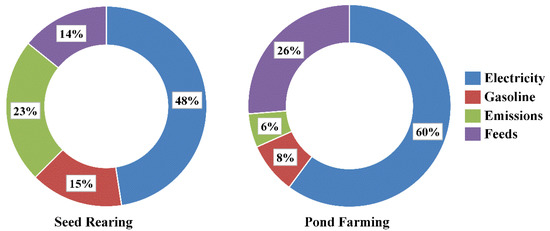 According to the LCA results in this study, the pond-farming stage and MAETP showed the largest environmental impact contributions for the entire largemouth bass freshwater pond aquaculture process. Moreover, the environmental contributions of electricity, gasoline, emissions, and feeds were classified. Electricity (48%) and emissions (23%) were two key factors in the seed-rearing stage, and electricity (60%) and feeds (26%) were two major impact contributors in the pond-farming stage (Figure 4). Feed production and electricity usage were still key issues that affected the fish pond aquaculture process [29,30,31]. Compared to open-water aquaculture systems [22,35], the environmental impact of electricity consumption was greater than that of feed production, the main reason being that electricity was mainly consumed to provide power for the farming machines to maintain the water quality and feeding work, but electricity in open-water aquaculture systems is only used in feed production, the main type of energy consumption is gasoline, and the environmental impacts are much lower than feed production. These results came to the same conclusions as those in previous LCA studies on China‘s aquaculture [9,24], and these issues will continue to be major environmental problems for China’s aquaculture industry in the next few years.