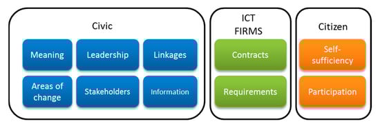 As Figure 4 shows, ICT supporting sustainability rather than being self-serving is based on the key concept of knowing in relation to three elements: the civic (local government), the ICT firms and the citizen. In terms of the civic element, knowing is linked to six key themes: knowing what smart and sustainable means; knowing who is leading; knowing how things fit together; knowing what needs to change; knowing who needs to be involved; and knowing through data and information. The ICT firm element is linked to two main concepts: knowing the impact of the contracts on ICT and sustainability alignment and knowing the requirements. The citizen element is linked to two main concepts: knowing for self-sufficiency and knowing for participation. Accordingly, the themes of this research’s findings have also been categorised.