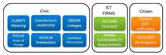 The study found that ICT supporting sustainability rather than being self-serving is based on the key concept of knowing in relation to three elements: the civic (local government), the ICT firms and the citizen. In the context of smart cities, ICT has a key role in supporting sustainability but the effort needs to be put into ‘knowing’ that then enables ‘doing’, ensuring that what is undertaken is effective, in that it is what is required, and that view is shared and agreed upon. Figure 5 illustrates that different elements in smart cities will have different interests and priorities in relation to ICT and sustainability. ICT firms’ interest obviously prioritizes ICT. Civic interest is clearly high in terms of sustainability but also in terms of leveraging ICT infrastructure. Citizens and citizen groups will have very diverse and wide-ranging priorities; hence, they are shown as being potentially positioned in any of the four quadrants. The purpose of knowing is not to move a particular element’s priority or interest from one part of the matrix to another. Instead, it is to recognise these differences and identify how to connect those different interests and priorities. This is to help ensure that ICT supports sustainability and reduces the likelihood of it being self-serving.