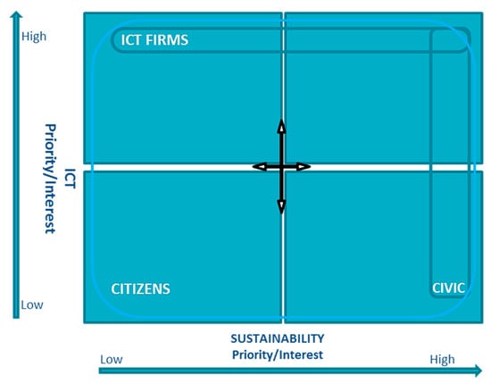In order for ICT to support sustainability goals in the context of a smart city, cities need to be absolutely clear about what smart means and how sustainability relates to that. The findings of this research showed how lack of clarity of meaning and ideas that are too broad limits understanding and acceptance. The provision of data and information via integrated platforms is a key concept for a smart city [26]. According to the findings of this research, this has implications for the role of ICT in the automatic capture of data via sensors and data availability, integration and the accessibility of data. This is consistent with a number of the definitions explored in Section 2. Integrated systems linking the physical to the information, e.g., energy flows, were also suggested. As we identified in Section 4, there is tension in terms of who pays for the significant underlying infrastructure that is required to make much of this possible. This is comparable to the nature of investments in ‘resilience’ in cities where the savings are not clear-cut, longer term and the benefits are not directly returned to individual economic agents. Moreover, sustainability is often ‘hijacked’ as a term to focus on low carbon; however, an “emphasis on entrepreneurialism and market forces to reduce carbon emissions can exclude other environmental factors which need to be addressed to make cities sustainable” [38]. Figure 6 illustrates that different elements in smart cities will have differing interests and priorities in relation to ICT and sustainability. ICT firms’ interest obviously prioritizes ICT. Civic interest is clearly high in terms of sustainability but also in terms of leveraging ICT infrastructure. Citizens and citizen groups will have very diverse and wide-ranging priorities and hence they are shown as being potentially positioned in any of the four quadrants (represented by the black arrow). The purpose of knowing is not to move a particular element’s priority or interest from one part of the matrix to another. Instead, it is to recognise these differences and identify how to connect those different interests and priorities. This is to help ensure that ICT supports sustainability and reduces the likelihood of it (the ICT) being self-serving.