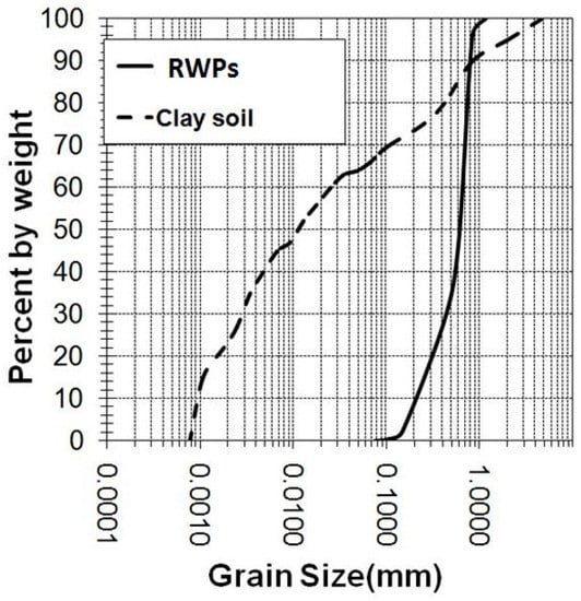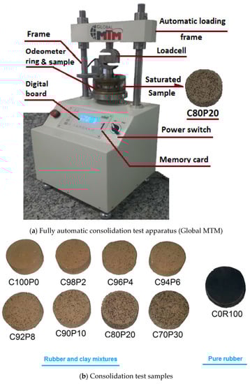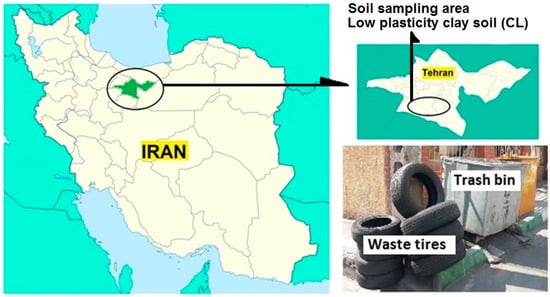 A review of the literature here explains that although a major portion of clay in the nature and civil projects are of low-plasticity type where rubber waste can be used as filler materials, no comprehensive study has been so far fulfilled on the deformation behavior of clay–rubber mixtures. It has been mentioned in various studies that the clay soil in the south of Tehran, Iran is known to be mainly composed of low-plasticity clay [,]. In this study, consolidation tests were accordingly performed on Tehran clay to characterize the properties of the mixture by adding rubber powder. Considering the need for understanding the strength properties of the mixture concerned, the uniaxial test was practiced, and the optimum moisture content (OMC) and the maximum dry density (MDD) of the mixture were experimentally determined. Accordingly, the aim is to reuse RWs as filler materials in civil and geotechnical engineering and reduce environmental problems caused by such wastes.