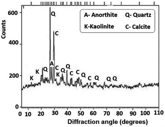Local investigations and site studies have always been of interest to researchers []. For this study, clay soil (CS) samples were collected from the southern region of Tehran, which were predominantly of the low-plasticity type [,,]. The choice of this natural CS was made with the intention of practical applicability for the results obtained. The samples were taken using a core cutter from a depth of 2 m, ensuring they were free from clay loam and made ground. The sampling location and waste tires near the trash bin in Tehran is also shown in Figure 1. XRD and XRF tests were carried out in the mining faculty of Amirkabir University of Technology and according to conventional methods. X-ray diffraction (XRD) analysis of the Tehran clay (Figure 2) revealed that the dominant clay mineral in this soil is kaolinite and, along with its chemical properties and constituent elements obtained from X-ray fluorescence (XRF), revealed that the clay primarily contains calcium oxide (CaO) and ferric oxide (Fe2O3) (Table 2). Additionally, the grading curve of the soil was determined using the Standard Test Method for Particle-Size Analysis (ASTM D422) [] (Figure 3). The results showed that 65% of the soil passed through sieve #200.