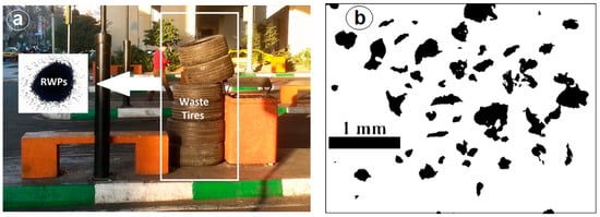 (a) Waste tires and RWPs, (b) Optical microscopic view of RWPs at 40× magnification.