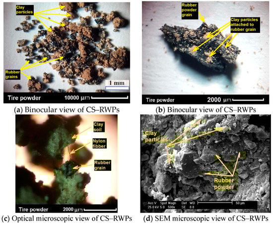 Observing the clay–rubber mixtures under a binocular allowed for capturing high-resolution images of these voluminous objects. Figure 5 exhibits views of the soil–rubber-water mixtures taken using a binocular, optical microscope, and SEM microscope. As depicted, there is cohesion between the CS and rubber particles. It is worth noting that clay minerals, including kaolinite, also contribute to water absorption, fostering good cohesion between CS, water, and rubber, leading to the favorable geotechnical performance of the mixture.